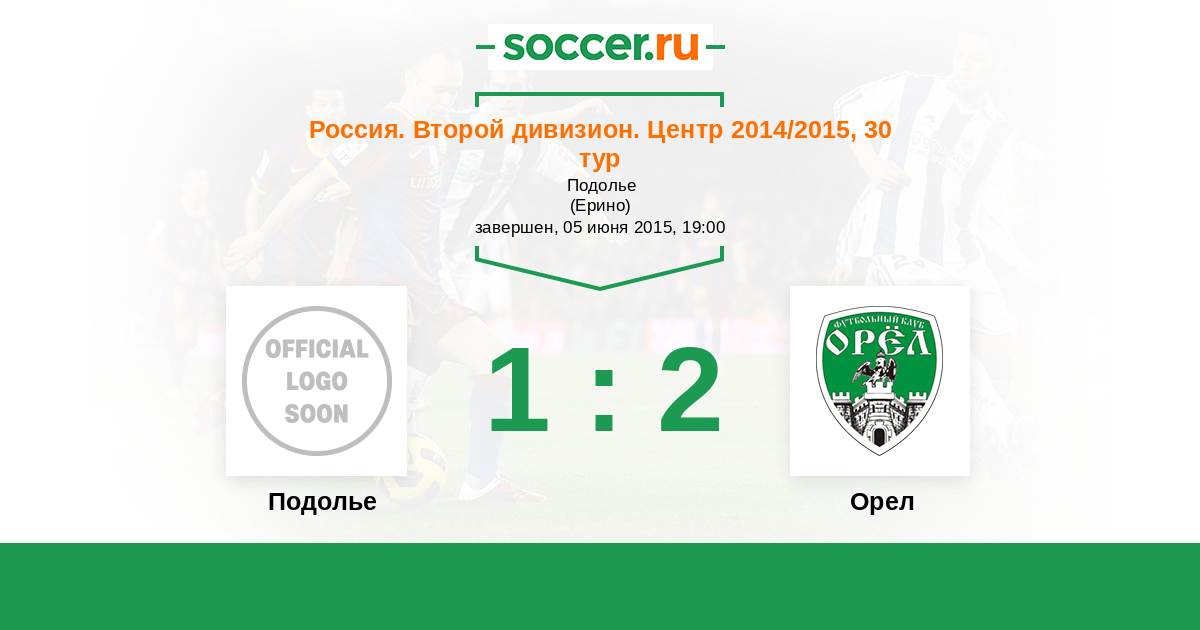 Россия. Вторая лига. Группа 3 05.06.2015 Подолье Логотип футбольный клуб Подолье (Подольский район) 1:2 Логотип футбольный клуб Орел Орел