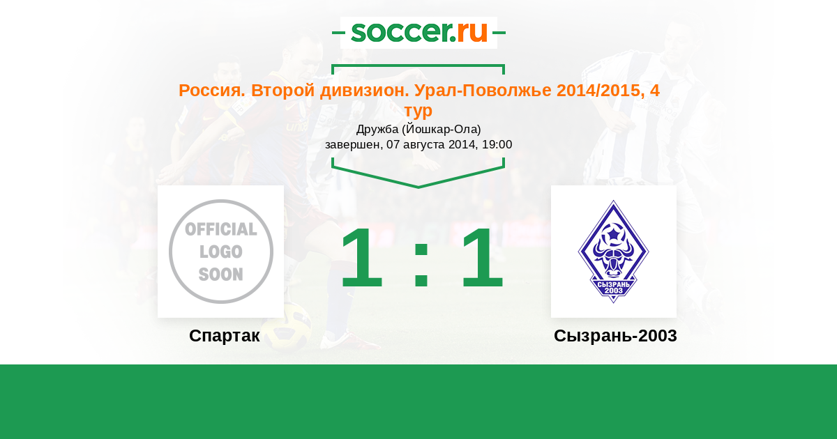 Россия. Вторая лига. Группа 4 06.05.2014 Спартак Логотип футбольный клуб Спартак (Йошкар-Ола) 1:1 Логотип футбольный клуб Сызрань-2003 Сызрань-2003