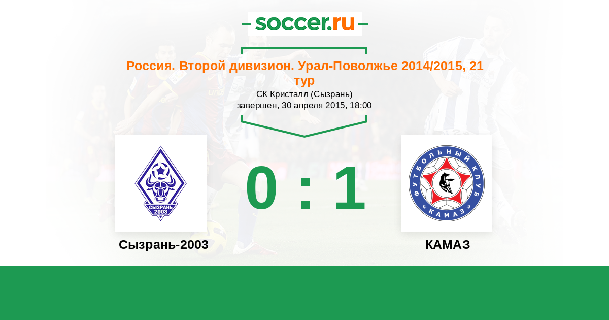 Россия. Вторая лига. Группа 4 24.05.2015 КАМАЗ Логотип футбольный клуб КАМАЗ (Набережные Челны) 0:2 Логотип футбольный клуб Сызрань-2003 Сызрань-2003
