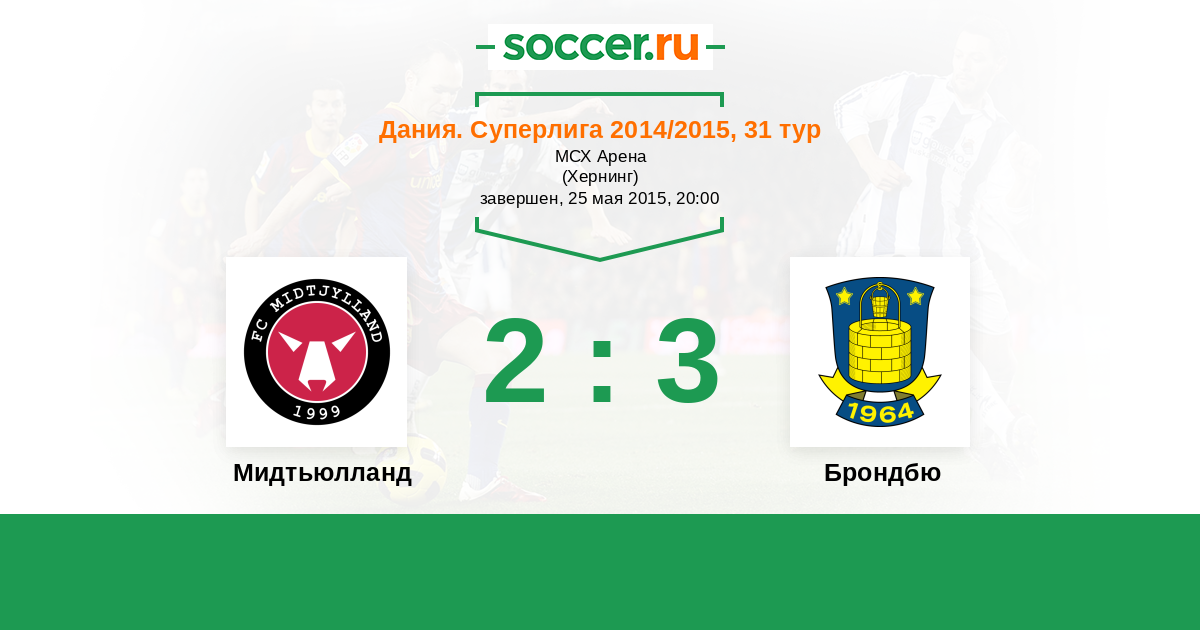 Дания. Суперлига 20.07.2014 Мидтьюлланд Логотип футбольный клуб Мидтьюлланд (Хернинг) 3:1 Логотип футбольный клуб Брондбю (Брённбю) Брондбю