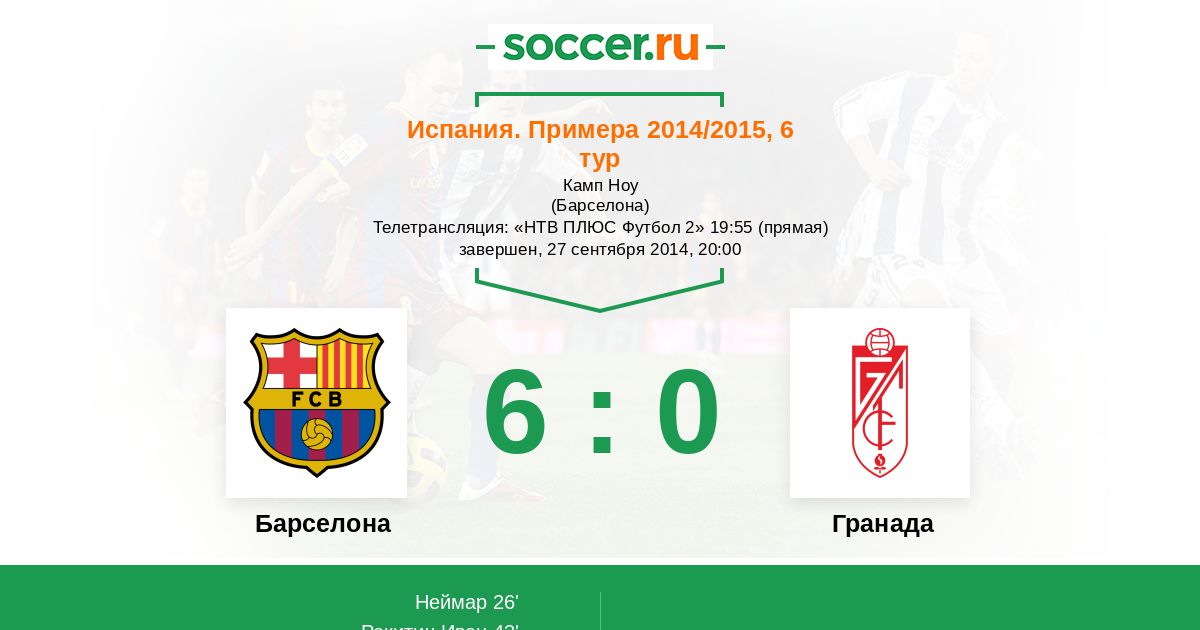 Испания. Примера 29.10.2016 Барселона Логотип футбольный клуб Барселона 1:0 Логотип футбольный клуб Гранада Гранада