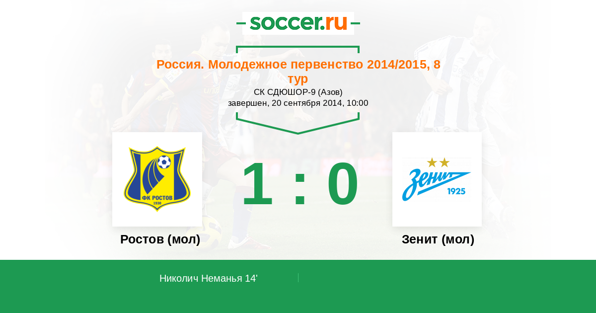 Россия. Премьер-Лига U21 02.10.2015 Зенит (мол) Логотип футбольный клуб Зенит (мол) (Санкт-Петербург) 2:0 Логотип футбольный клуб Ростов (мол) (Ростов-на-Дону) Ростов (мол)