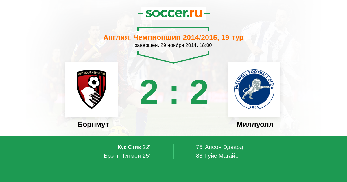 Англия. Чемпионшип 28.12.2014 Миллуолл Логотип футбольный клуб Миллуолл (Лондон) 0:2 Логотип футбольный клуб Борнмут Борнмут