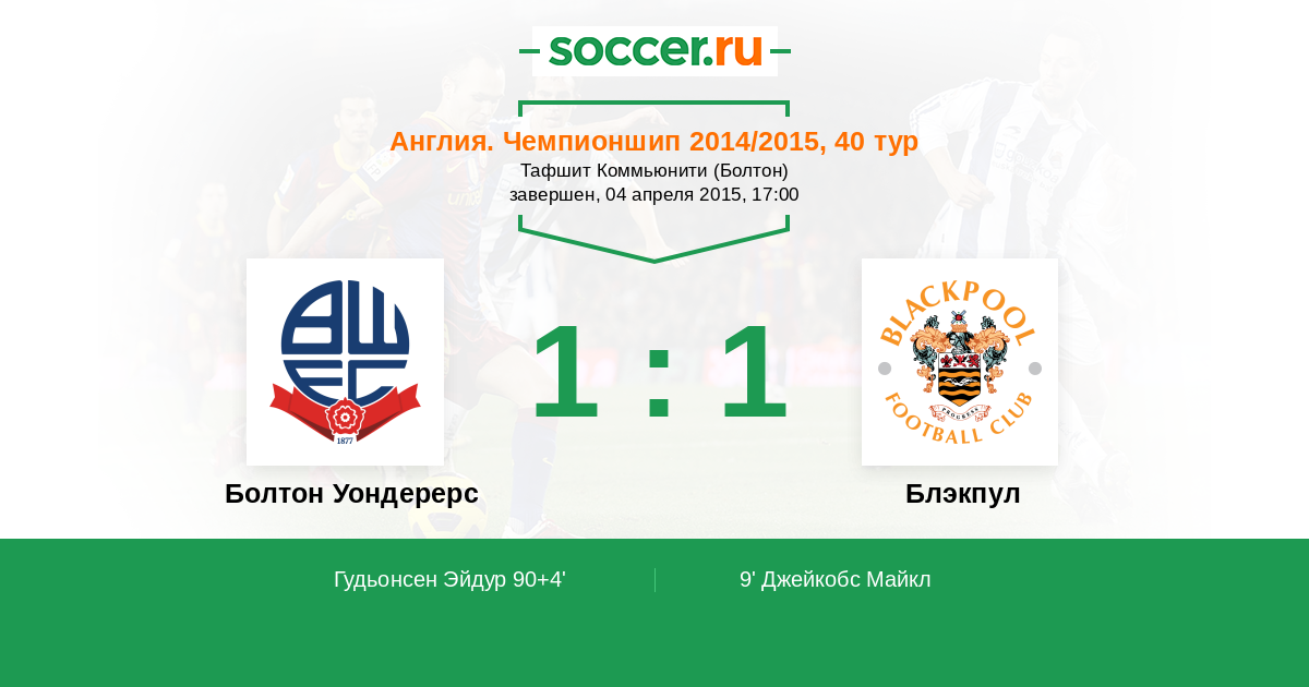 Англия. Чемпионшип 26.03.2014 Болтон Уондерерс Логотип футбольный клуб Болтон Уондерерс 1:0 Логотип футбольный клуб Блэкпул Блэкпул