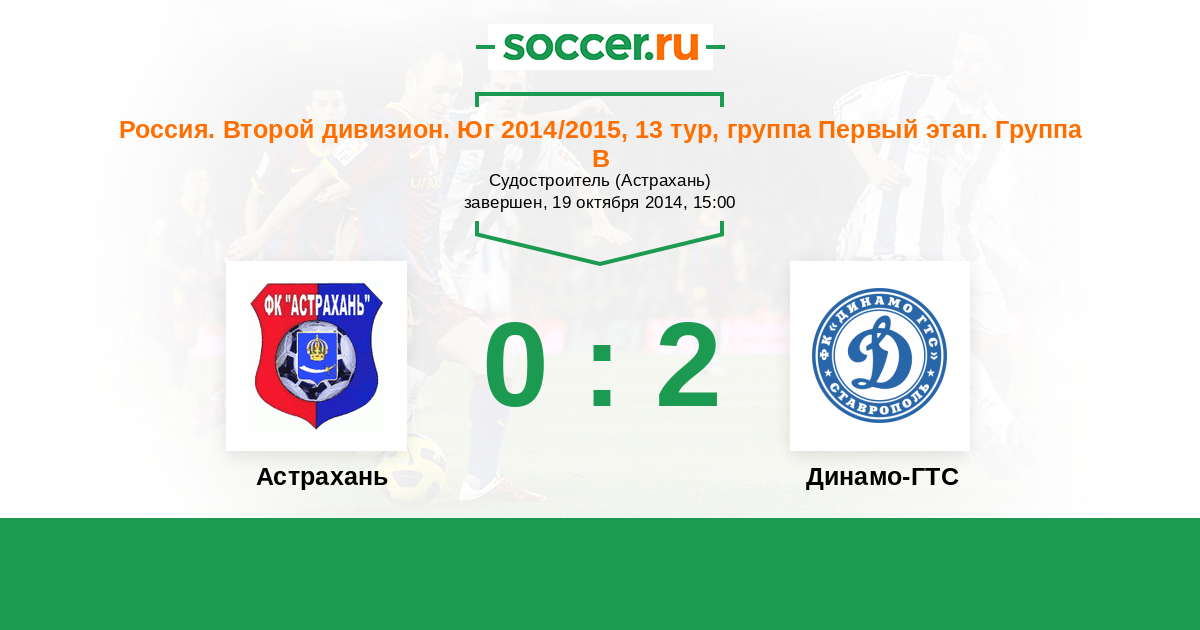 Россия. Вторая лига. Группа 1 20.08.2014 Динамо-ГТС Логотип футбольный клуб Динамо-ГТС (Ставрополь) 1:0 Логотип футбольный клуб Астрахань Астрахань