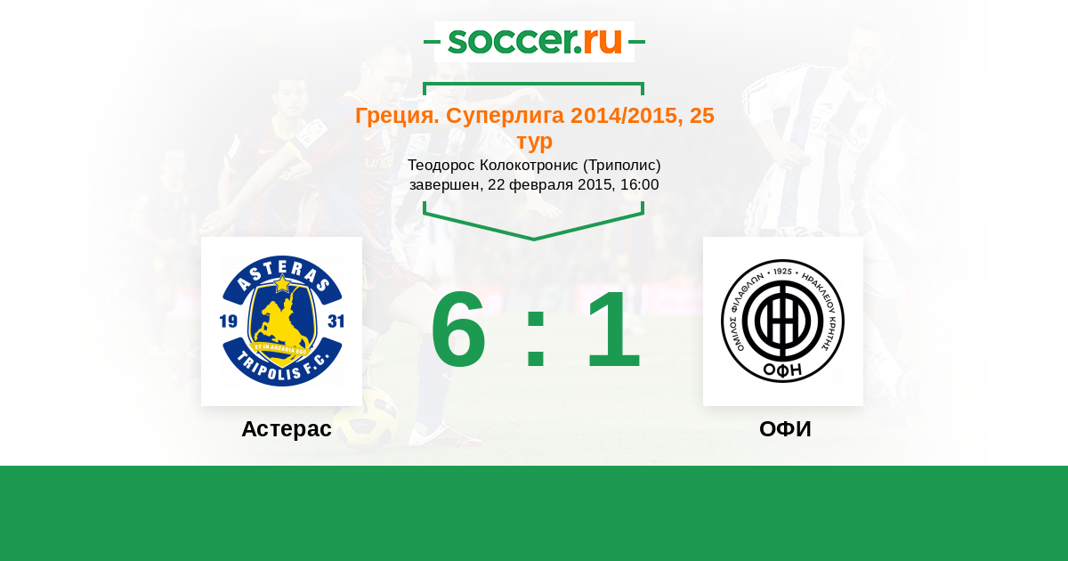 Греция. Суперлига 26.10.2014 ОФИ Логотип футбольный клуб ОФИ (Ираклион) 2:3 Логотип футбольный клуб Астерас (Триполис) Астерас