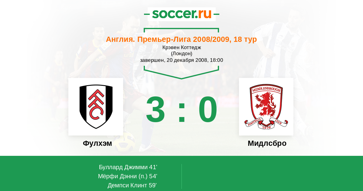 Англия. Премьер-Лига 18.12.2006 Фулхэм Логотип футбольный клуб Фулхэм (Лондон) 2:1 Логотип футбольный клуб Мидлсбро Мидлсбро