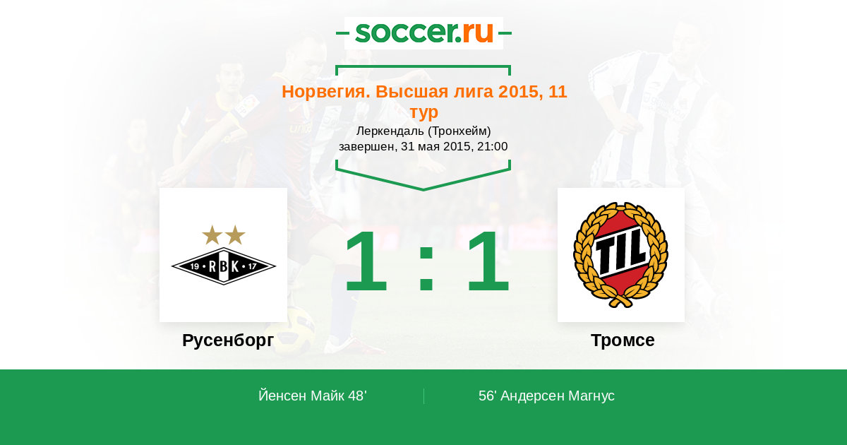 Норвегия. Высшая лига 19.06.2011 Русенборг Логотип футбольный клуб Русенборг (Тронхейм) 3:1 Логотип футбольный клуб Тромсе Тромсе