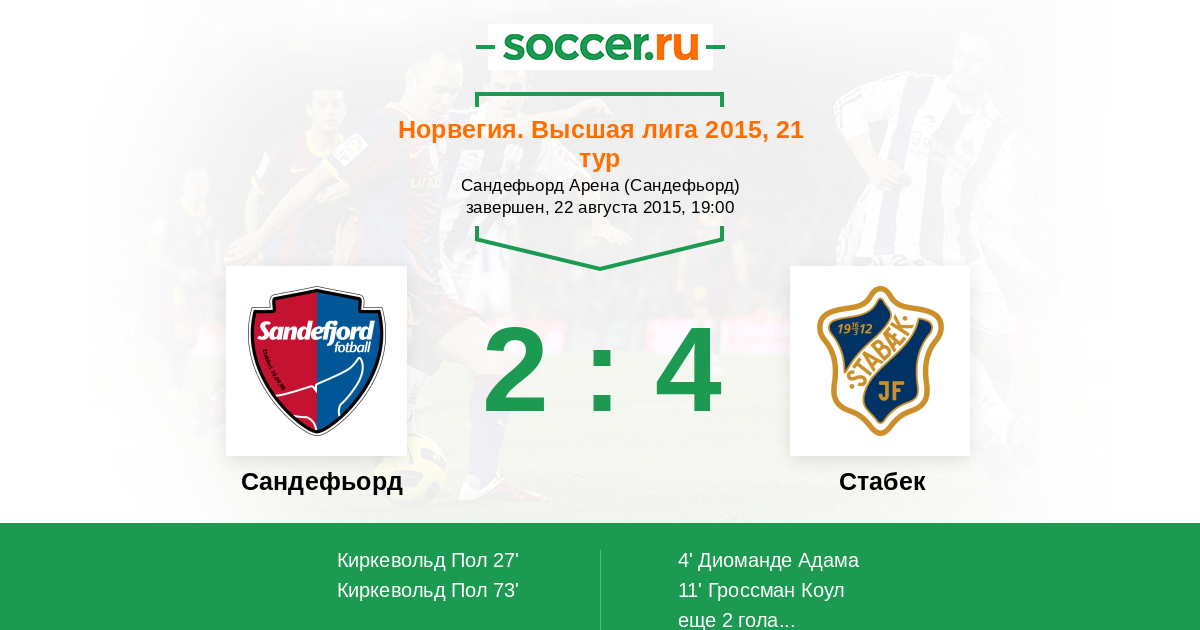 Норвегия. Высшая лига 13.05.2015 Стабек Логотип футбольный клуб Стабек (Берум) 4:0 Логотип футбольный клуб Сандефьорд Сандефьорд