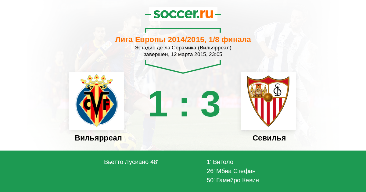 Лига Европы 19.03.2015 Севилья Логотип футбольный клуб Севилья 2:1 Логотип футбольный клуб Вильярреал Вильярреал