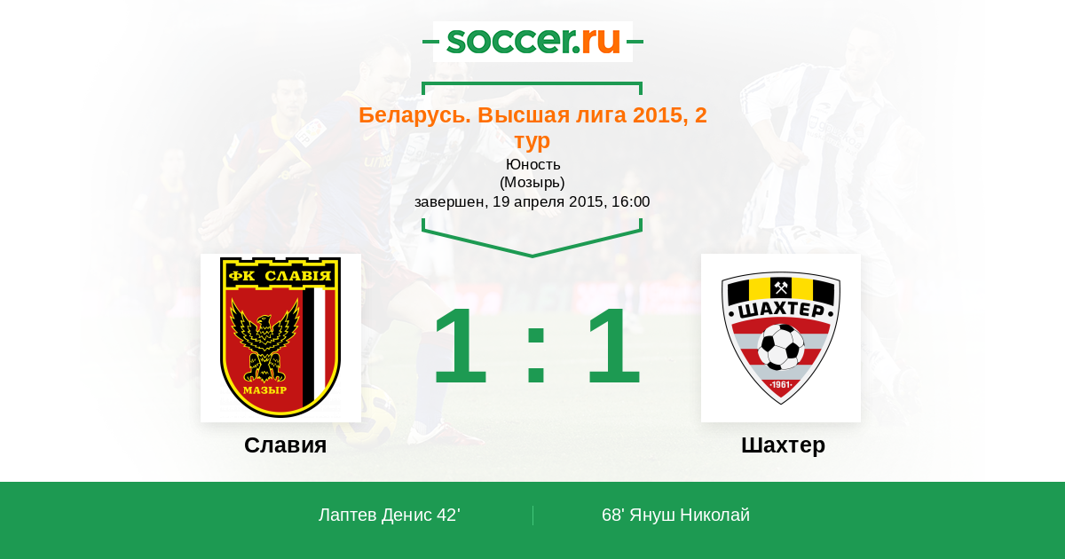 Беларусь. Высшая лига 25.06.2016 Славия Логотип футбольный клуб Славия (Мозырь) 1:1 Логотип футбольный клуб Шахтер (Солигорск) Шахтер