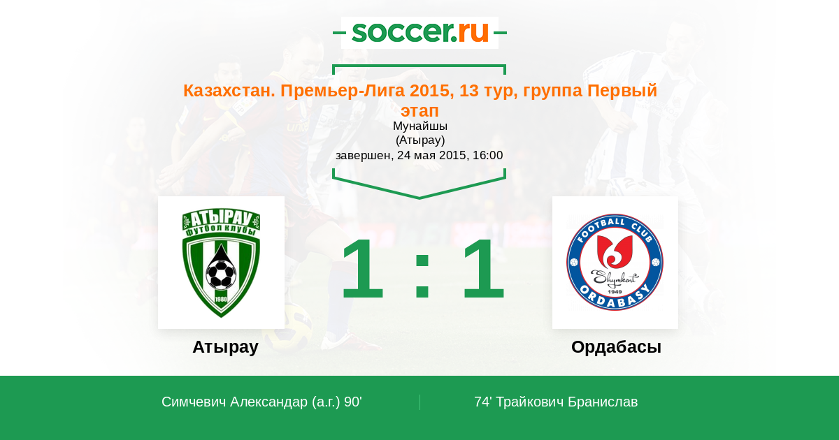Казахстан. Премьер-лига 05.07.2014 Ордабасы Логотип футбольный клуб Ордабасы (Шымкент) 1:0 Логотип футбольный клуб Атырау Атырау