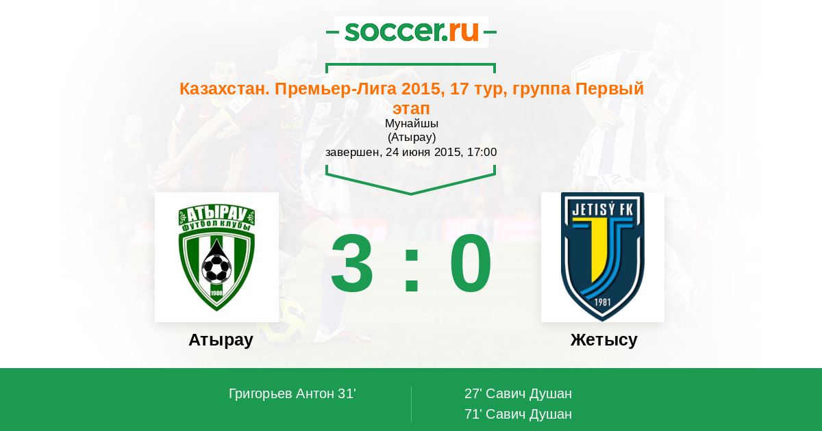 Казахстан. Премьер-лига 28.06.2014 Атырау Логотип футбольный клуб Атырау 1:2 Логотип футбольный клуб Жетысу (Талдыкорган) Жетысу