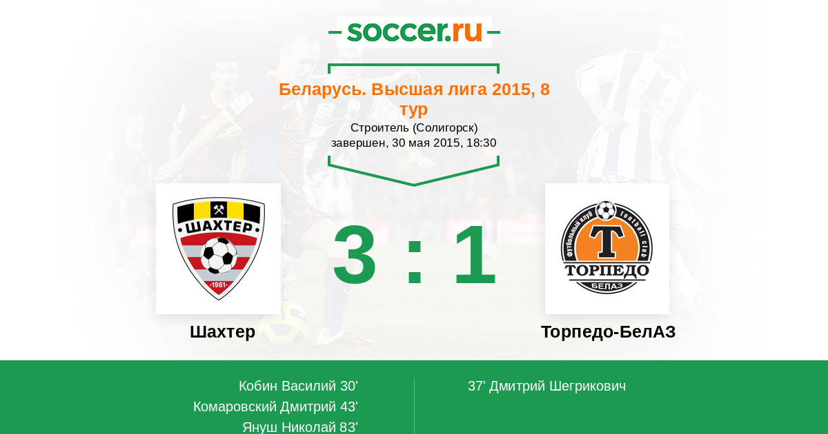 Беларусь. Высшая лига 26.09.2015 Торпедо-БелАЗ Логотип футбольный клуб Торпедо-БелАЗ (Жодино) 3:0 Логотип футбольный клуб Шахтер (Солигорск) Шахтер