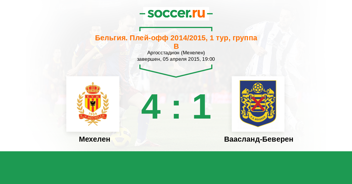 Бельгия. Про-Лига 09.05.2015 Ваасланд-Беверен Логотип футбольный клуб Ваасланд-Беверен 1:2 Логотип футбольный клуб Мехелен Мехелен