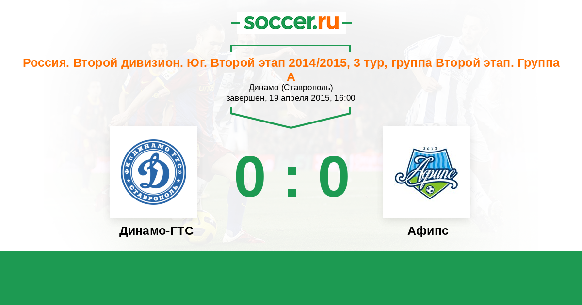 Россия. Вторая лига. Группа 1 19.04.2015 Динамо-ГТС Логотип футбольный клуб Динамо-ГТС (Ставрополь) 0:0 Логотип футбольный клуб Афипс (Афипский) Афипс