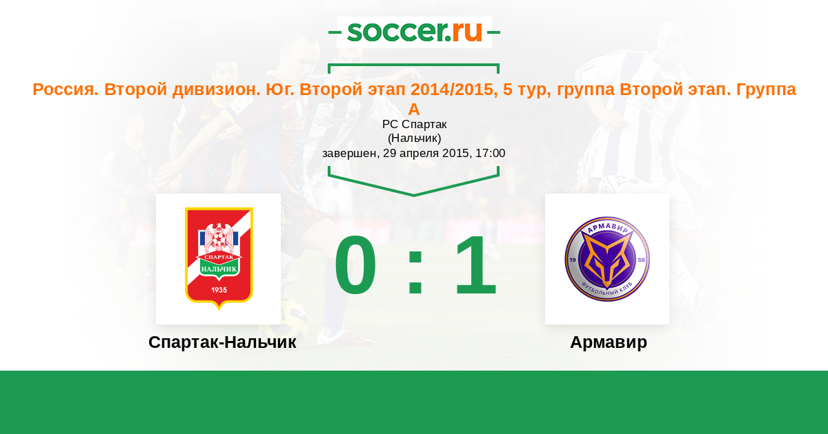 Россия. Вторая лига. Группа 1 16.05.2018 Спартак-Нальчик Логотип футбольный клуб Спартак-Нальчик 0:2 Логотип футбольный клуб Армавир Армавир