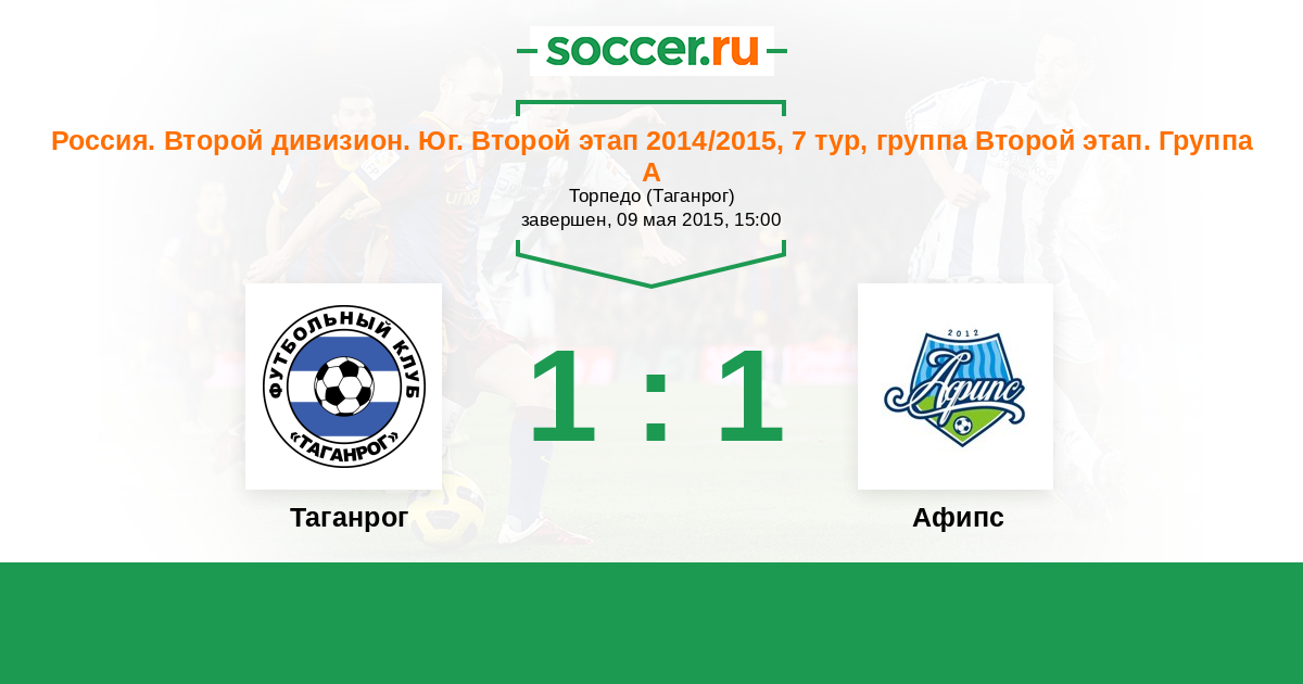 Россия. Вторая лига. Группа 1 09.05.2015 Таганрог Логотип футбольный клуб Таганрог 1:1 Логотип футбольный клуб Афипс (Афипский) Афипс