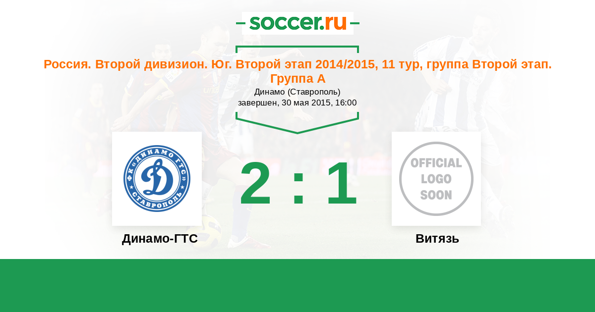 Россия. Вторая лига. Группа 1 30.05.2015 Динамо-ГТС Логотип футбольный клуб Динамо-ГТС (Ставрополь) 2:1 Логотип футбольный клуб Витязь (Крымск) Витязь