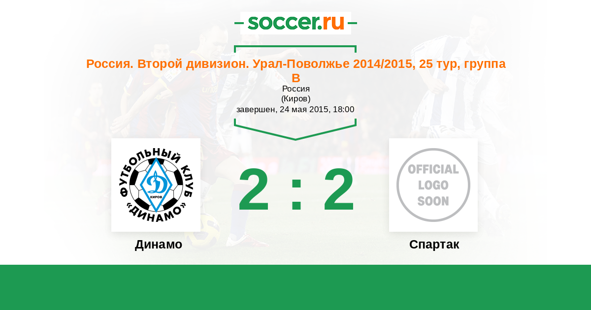 Россия. Вторая лига. Группа 4 24.05.2015 Динамо Киров Логотип футбольный клуб Динамо Киров 2:2 Логотип футбольный клуб Спартак (Йошкар-Ола) Спартак