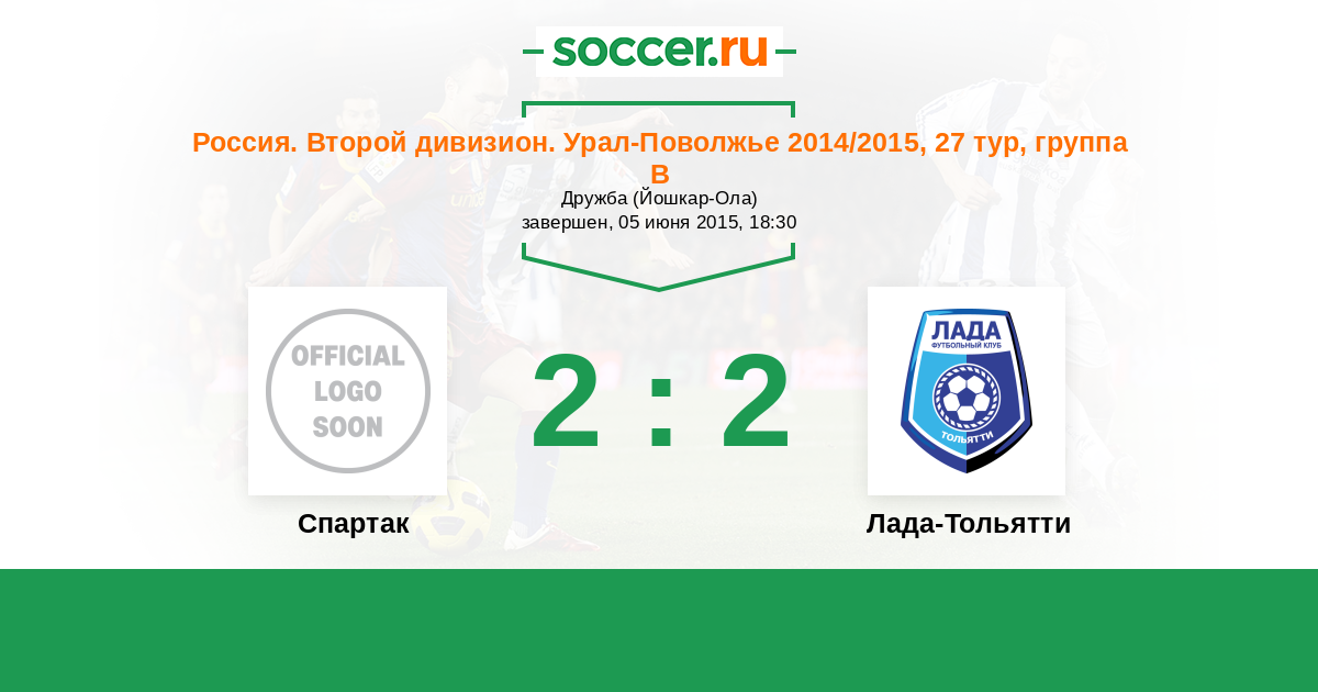 Россия. Вторая лига. Группа 4 05.06.2015 Спартак Логотип футбольный клуб Спартак (Йошкар-Ола) 2:2 Логотип футбольный клуб Лада-Тольятти Лада-Тольятти