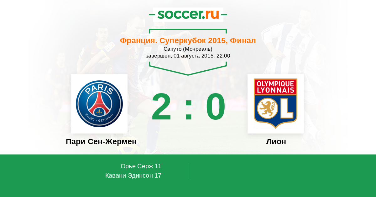 Франция. Суперкубок 06.08.2016 Пари Сен-Жермен Логотип футбольный клуб Пари Сен-Жермен (Париж) 4:1 Логотип футбольный клуб Лион Лион