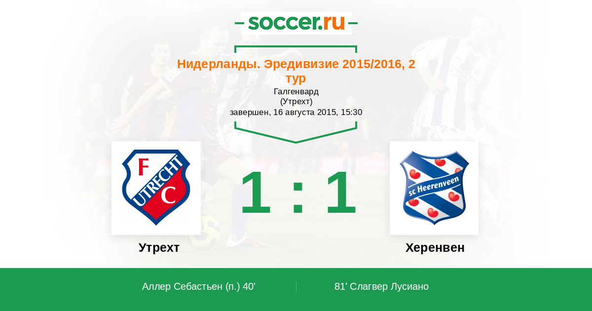 Нидерланды. Эредивизи 12.08.2016 Херенвен Логотип футбольный клуб Херенвен 2:2 Логотип футбольный клуб Утрехт Утрехт