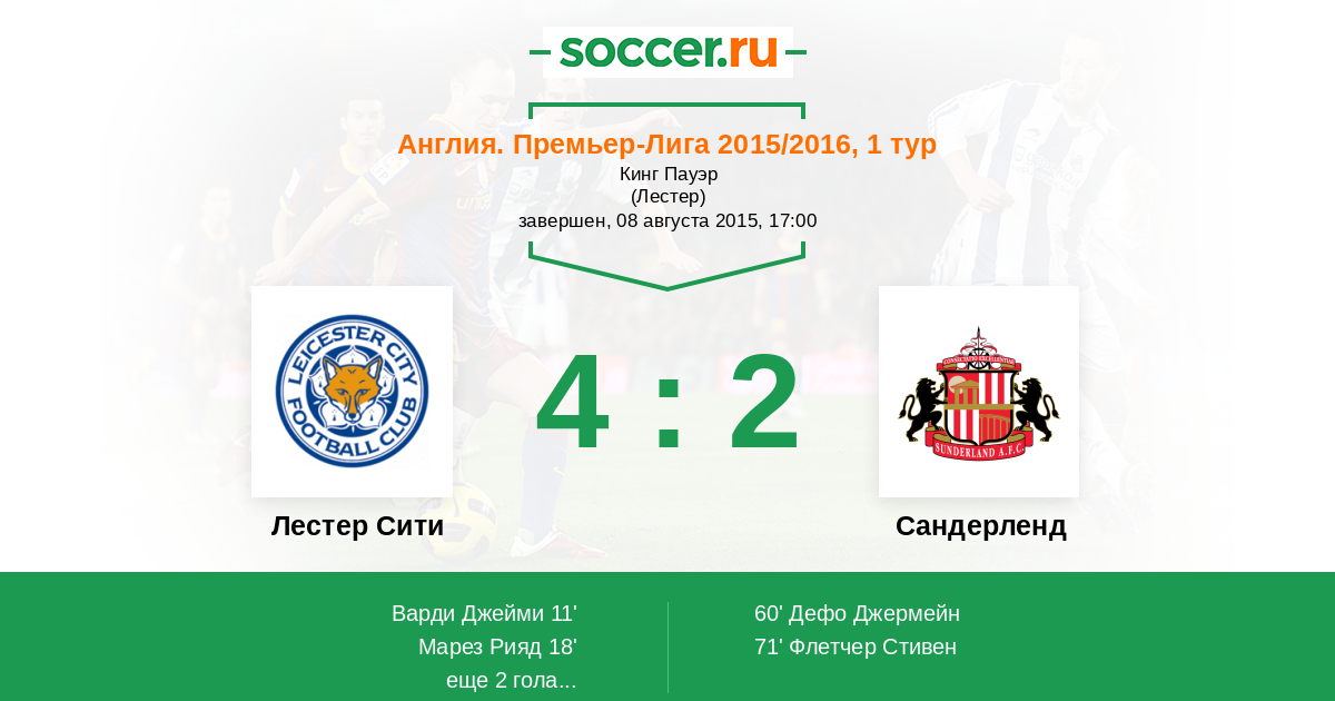 Англия. Премьер-Лига 10.04.2016 Сандерленд Логотип футбольный клуб Сандерленд 0:2 Логотип футбольный клуб Лестер Сити Лестер Сити