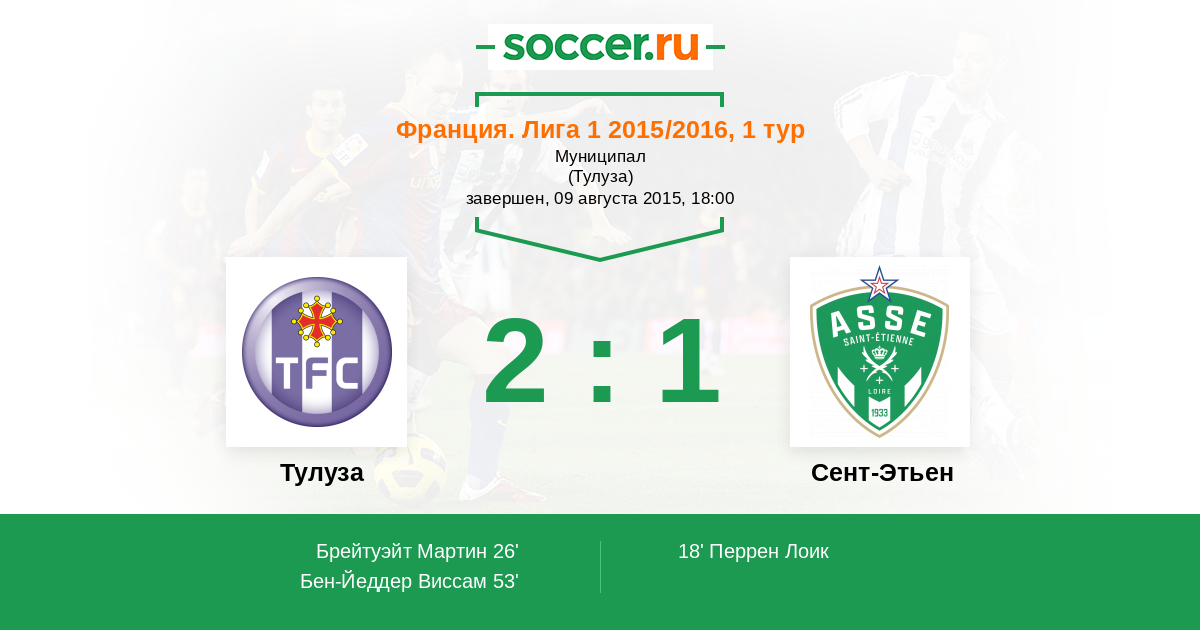 Франция. Лига 1 18.08.2012 Тулуза Логотип футбольный клуб Тулуза 2:1 Логотип футбольный клуб Сент-Этьен Сент-Этьен