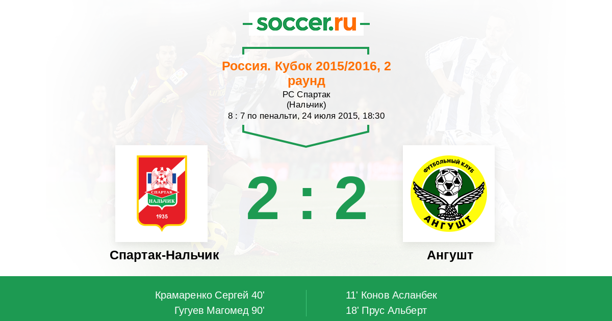 Россия. Вторая лига. Группа 1 12.08.2014 Ангушт Логотип футбольный клуб Ангушт (Назрань) 3:2 Логотип футбольный клуб Спартак-Нальчик Спартак-Нальчик