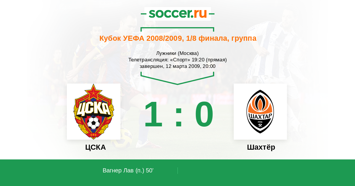 Лига Европы 19.03.2009 Шахтёр Логотип футбольный клуб Шахтёр (Донецк) 2:0 Логотип футбольный клуб ЦСКА (Москва) ЦСКА