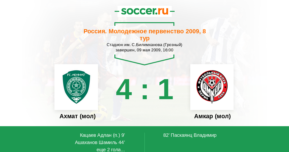 Россия. Премьер-Лига U21 19.09.2009 Амкар (мол) Логотип футбольный клуб Амкар (мол) (Пермь) 2:1 Логотип футбольный клуб Терек (мол) (Грозный) Терек (мол)