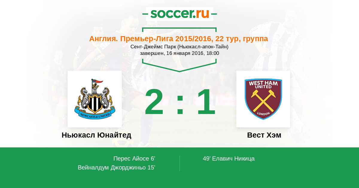 Англия. Премьер-Лига 14.09.2015 Вест Хэм Логотип футбольный клуб Вест Хэм (Лондон) 2:0 Логотип футбольный клуб Ньюкасл Юнайтед (Ньюкасл-апон-Тайн) Ньюкасл Юнайтед