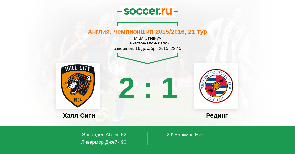 Англия. Чемпионшип 19.04.2016 Рединг Логотип футбольный клуб Рединг 1:2 Логотип футбольный клуб Халл Сити (Кингстон-апон-Халл) Халл Сити