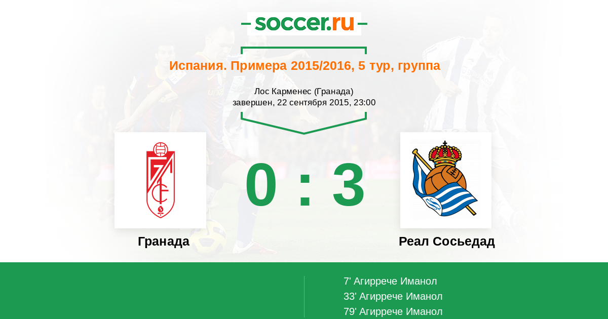 Испания. Примера 17.05.2015 Реал Сосьедад Логотип футбольный клуб Реал Сосьедад (Сан-Себастьян) 0:3 Логотип футбольный клуб Гранада Гранада