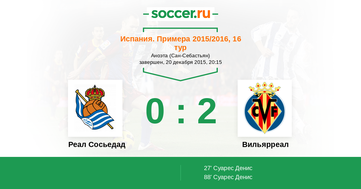 Испания. Примера 07.12.2014 Вильярреал Логотип футбольный клуб Вильярреал 4:0 Логотип футбольный клуб Реал Сосьедад (Сан-Себастьян) Реал Сосьедад
