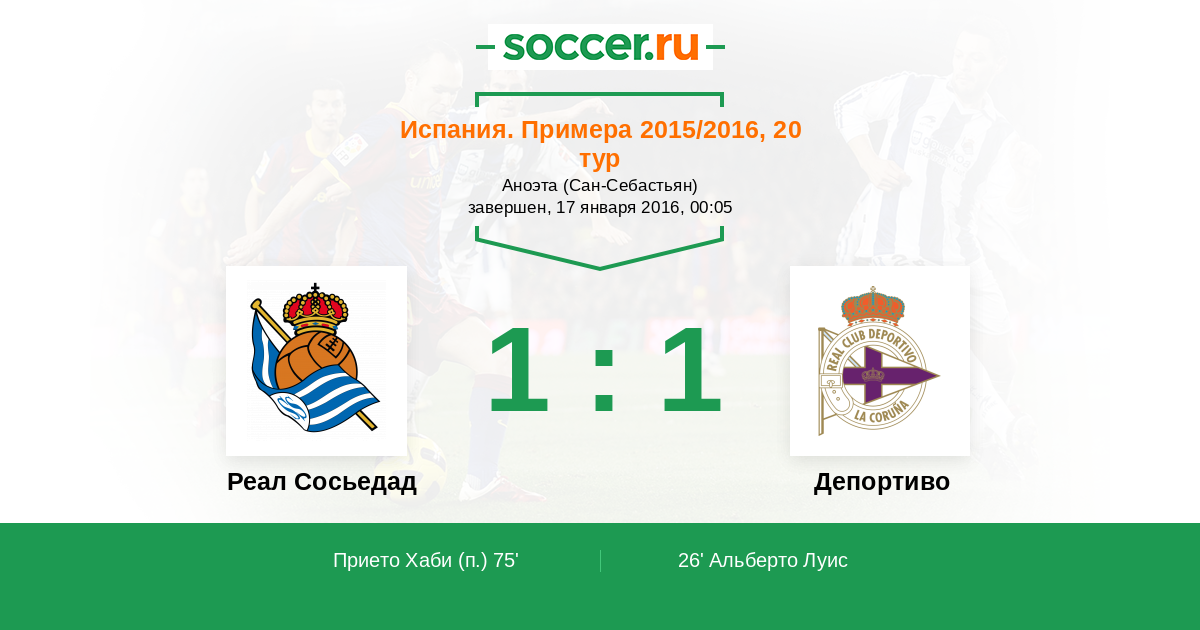 Испания. Примера 22.08.2015 Депортиво Логотип футбольный клуб Депортиво (Ла-Корунья) 0:0 Логотип футбольный клуб Реал Сосьедад (Сан-Себастьян) Реал Сосьедад