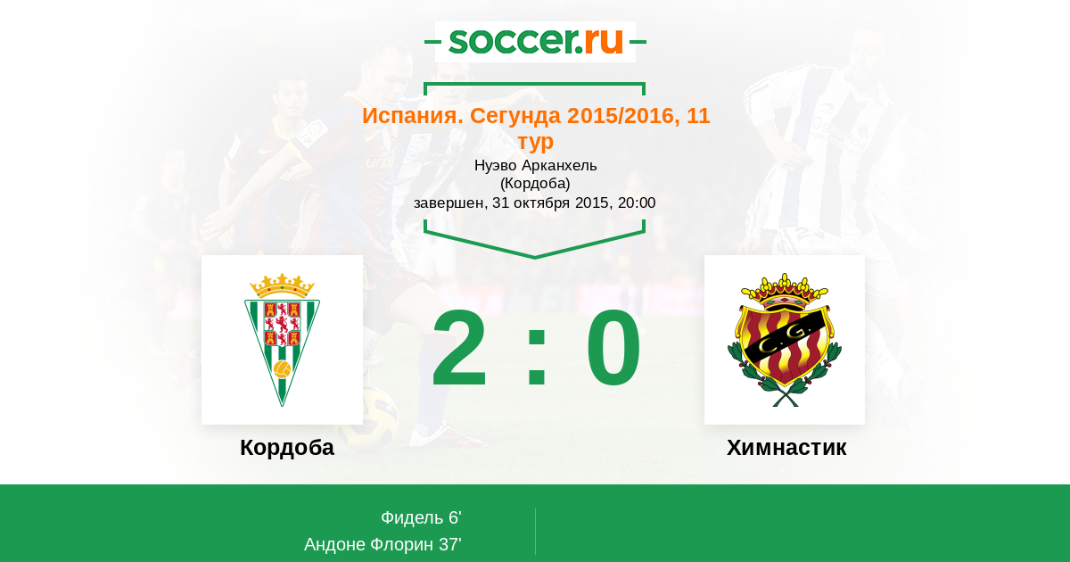 Испания. Сегунда 15.10.2017 Кордоба Логотип футбольный клуб Кордоба 1:5 Логотип футбольный клуб Химнастик (Таррагона) Химнастик