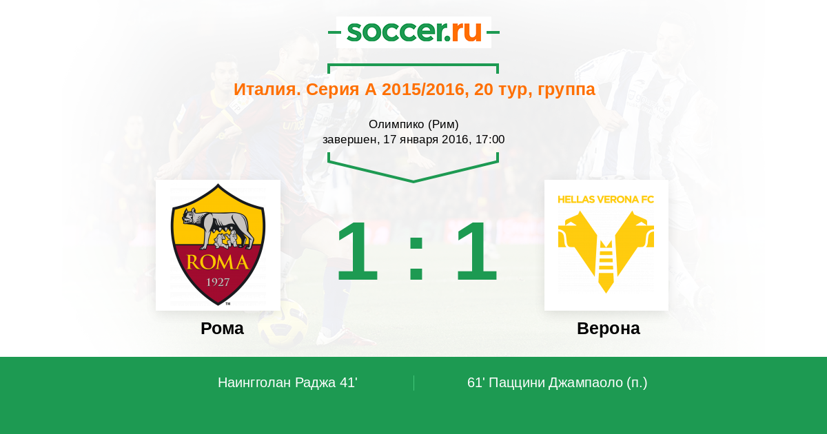 Италия. Серия А 16.09.2017 Рома Логотип футбольный клуб Рома (Рим) 3:0 Логотип футбольный клуб Верона Верона