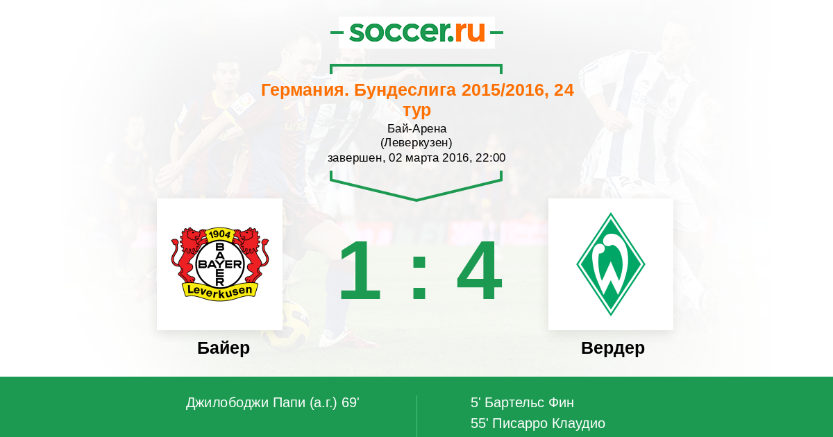 Германия. Бундеслига 26.09.2015 Вердер Логотип футбольный клуб Вердер (Бремен) 0:3 Логотип футбольный клуб Байер (Леверкузен) Байер