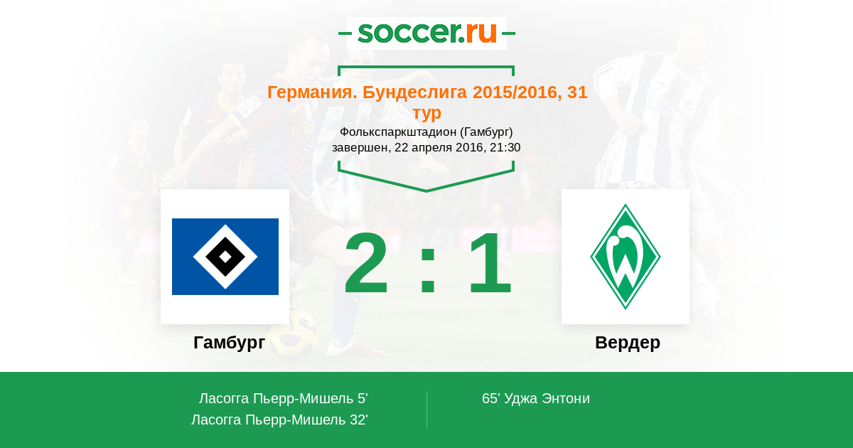 Германия. Бундеслига 16.04.2017 Вердер Логотип футбольный клуб Вердер (Бремен) 2:1 Логотип футбольный клуб Гамбург Гамбург