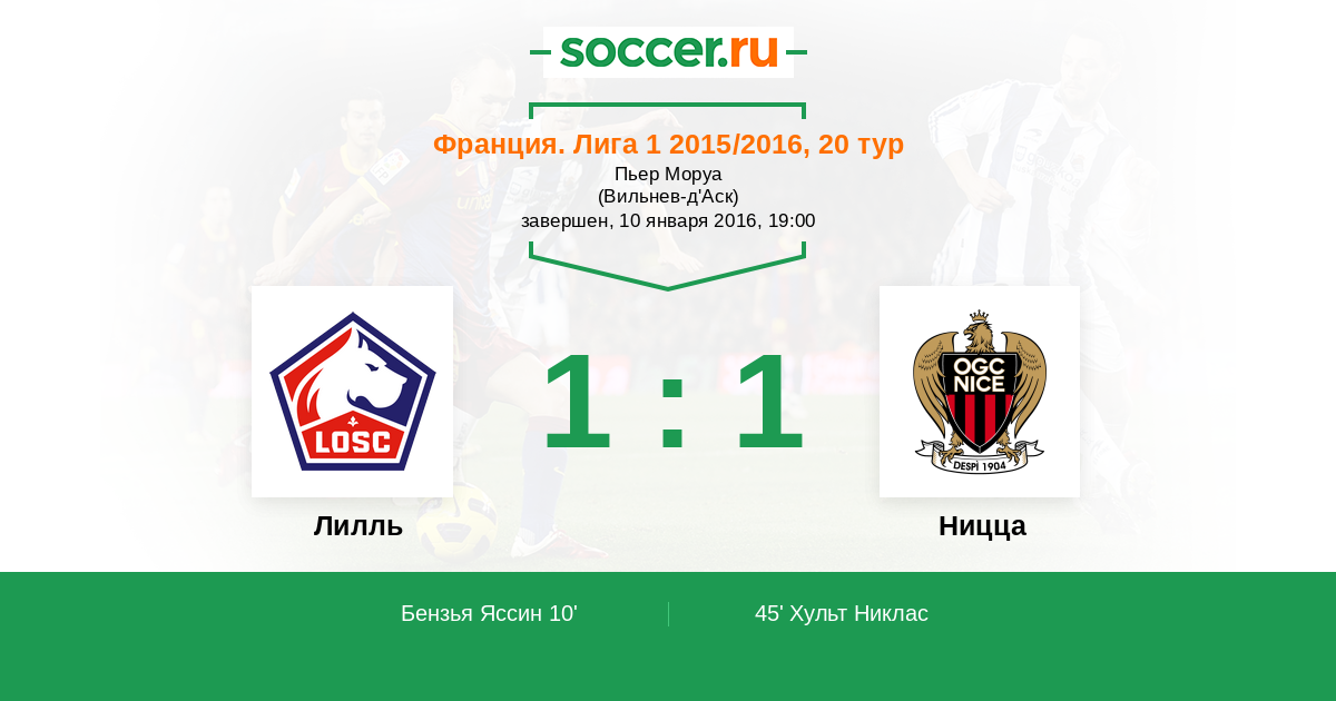 Франция. Лига 1 01.11.2015 Ницца Логотип футбольный клуб Ницца 0:0 Логотип футбольный клуб Лилль Лилль