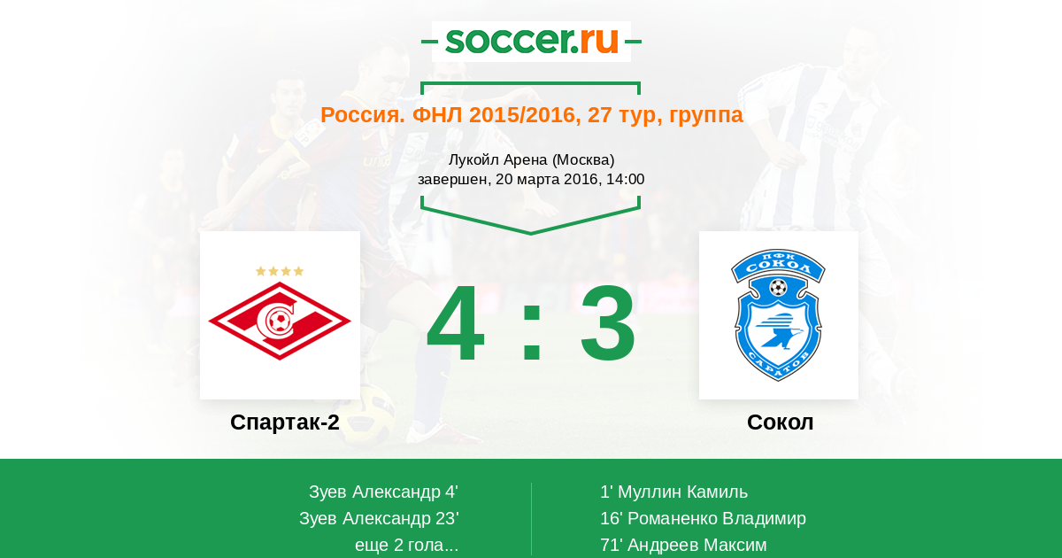 Россия. Первая лига 01.08.2016 Спартак-2 Логотип футбольный клуб Спартак-2 (Москва) 3:2 Логотип футбольный клуб Сокол (Саратов) Сокол
