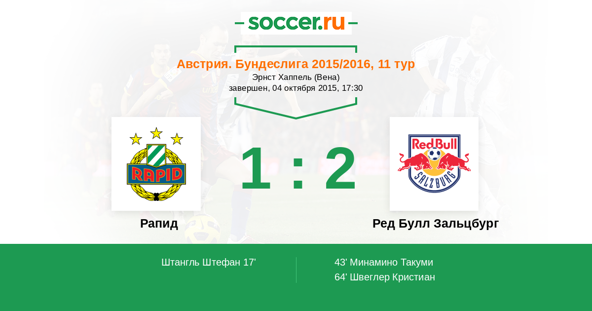 Австрия. Бундеслига 13.12.2015 Ред Булл Зальцбург Логотип футбольный клуб Ред Булл Зальцбург 2:0 Логотип футбольный клуб Рапид (Вена) Рапид