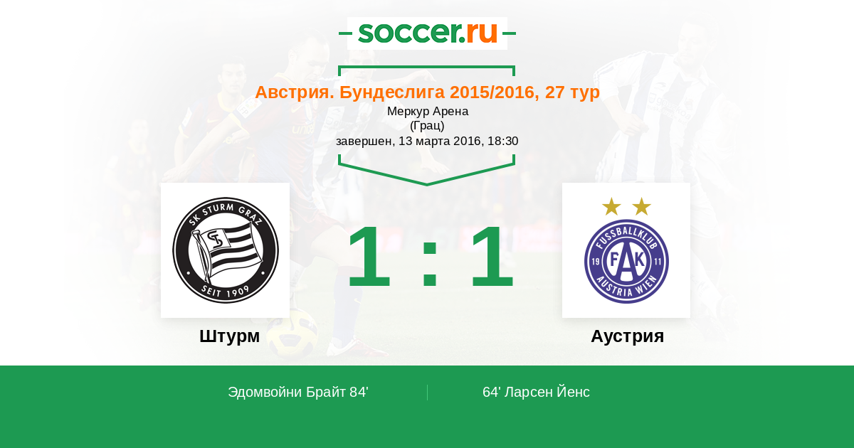 Австрия. Бундеслига 24.03.2012 Аустрия Логотип футбольный клуб Аустрия (Вена) 1:1 Логотип футбольный клуб Штурм (Грац) Штурм