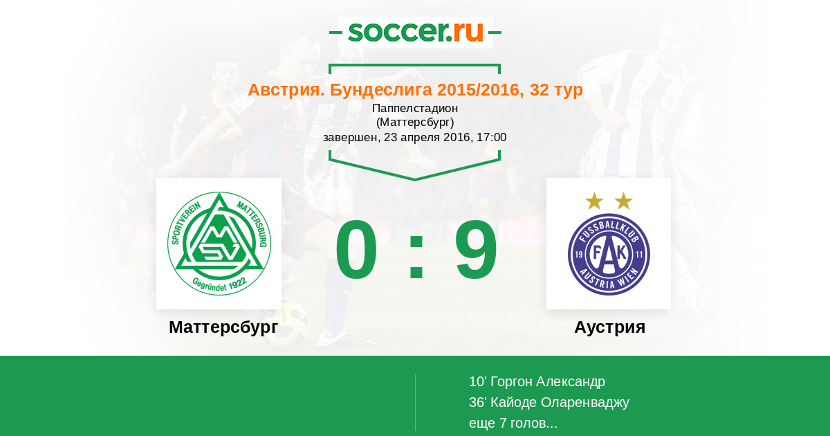 Австрия. Бундеслига 16.04.2017 Маттерсбург Логотип футбольный клуб Маттерсбург 0:3 Логотип футбольный клуб Аустрия (Вена) Аустрия