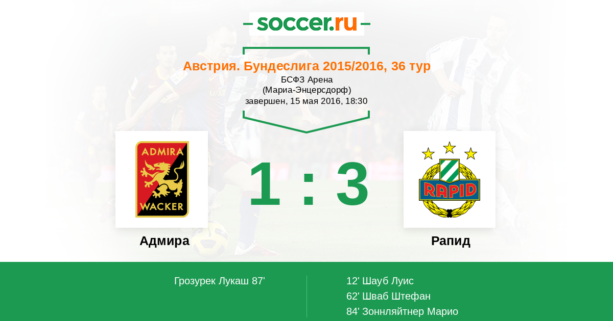 Австрия. Бундеслига 12.03.2016 Рапид Логотип футбольный клуб Рапид (Вена) 0:4 Логотип футбольный клуб Адмира (Мёдлинг) Адмира