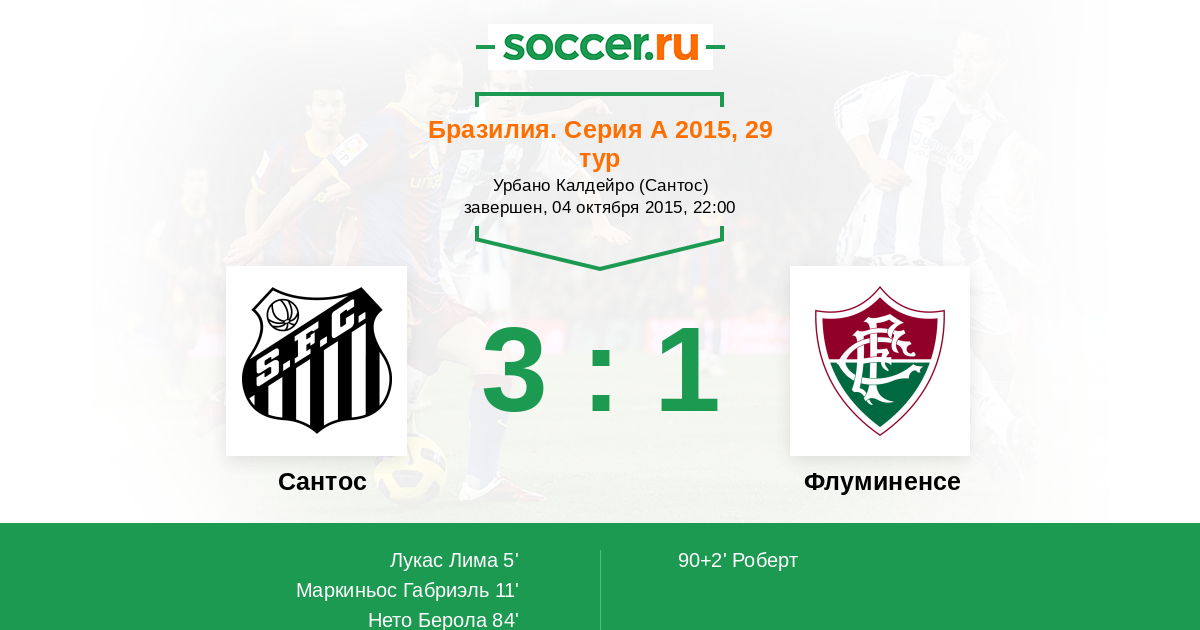 Бразилия. Серия А 23.06.2016 Флуминенсе Логотип футбольный клуб Флуминенсе (Рио-де-Жанейро) 2:4 Логотип футбольный клуб Сантос (Сан-Паулу) Сантос