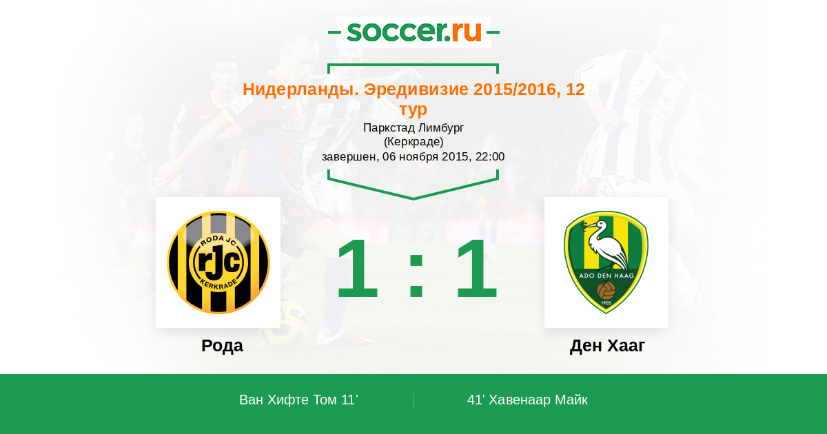 Нидерланды. Эредивизи 22.10.2016 Рода Логотип футбольный клуб Рода (Керкраде) 1:1 Логотип футбольный клуб Ден Хааг (Гаага) Ден Хааг