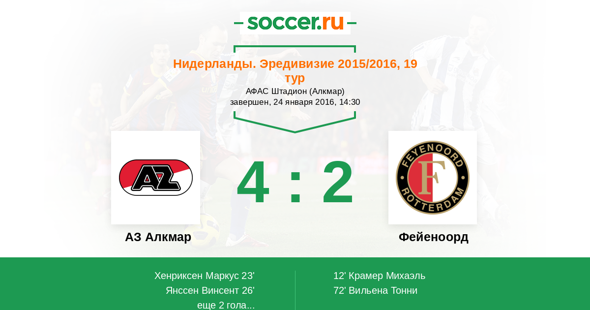 Нидерланды. Эредивизи 14.12.2014 Фейеноорд Логотип футбольный клуб Фейеноорд (Роттердам) 2:2 Логотип футбольный клуб АЗ Алкмар АЗ Алкмар